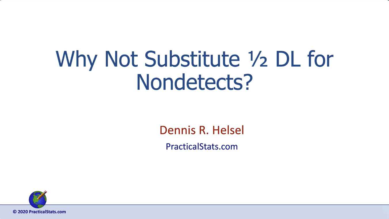 Nondetects And Data Analysis (NADA) teaches statistical methods for computing summary statistics, hypothesis tests, regression, and more, all for data with nondetects while avoiding the use of fabricated values such as 1/2 the detection limit. Adding fabricated data causes many (usually unintended) problems such as incorrect estimates of the mean, incorrect hypothesis test results, and sub-optimal regression equations. Instead, methods designed for censored data (data with nondetects in this case) avoid these problems and produce far more reliable and defensible results. After great expense for salaries, field collection and laboratory analysis of low-level contaminants, do you really want to make up values for part of your data and then try to extract the information? To understand the problems that occur when fabrication of various sorts is used, see below either the short video of